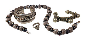 Lot Silberschmuck: Nord-Afrika, 1 Ring, RW ca. 54; 1 Armspange mit 3 Kugeln; 1 Armspange mit parallelem Muster (Äypten); 1 Kette mit Silberteilen u. Glaskugeln, L ca. 51,5 cm, total 379,0 g