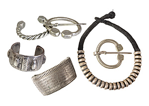 Lot: 6 Stück, Etnologischer Schmuck, vorwiegend aus Mauretanien/Niger, Silber, 1 Ketten auf Stoffband; 1 Armreif, B = 32,6 mm, innen ca. 54,5 x 47,5 mm 172 g; 1 gedrehter Armreif; 1 breites Armband, L = 21,5 cm u. 2 Gewandfibeln, total 682 g