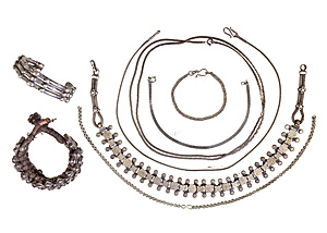 Lot: alter Etnologischer Schmuck, Turkmenistan/Afghanistan, 10 Stück, Silber, 1 breiter Armreif B = 39,3 mm, innen ca. 54,5 x 45,6 mm, 2 Ketten mit Anhänger; 1 dekorativer Anhänger mit 7 abgehängten Schiffchen, H = 17,5 cm; 4 Ringe RW ca. 52, 57, u. 58; 1 Kette u. 1 Armband, total ca. 230 g