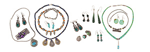 lot: sundry ethno-silver jewelry, 15 pieces, silver, 6 pairs of ear pendants, 3 rings, ring width c. 55, 56 and 61, 5 necklace, partially with pendants, set with lapis lazuli, cornelian and turquoise, length = 39.0, 45.0, 46.0, 47.5 and 53.5 cm, 1 bracelet ('60s modern), total 295 g