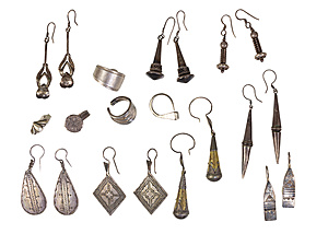Lot: 13 Stück, alter Schmuck aus Vorderasien/Nordafrika (oder der ganzen Welt !), Silber, 5 Ringe RW ca. 50 - 60 u. 8 Paar Ohrhänger, teilweise ornamentiert u. belötet, total 112 g