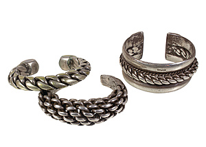 Lot: 3 Etnologische Armreifen/Armspangen, Silber, 1 breiter Armreif, mittig mit gedrehtem Band, B = 51,5 mm, innen ca. 58,0 x 52,0 mm; 2 weitere Armspangen, total 401 g