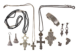 Alter TUAREK Schmuck, Silber, traditionelle Formen, Muster u. Ornamente, schwer gearbeiteter Armreif, B = 20,2 mm, innen ca. 59,0 x 46,0 mm; 1 Kette mit Anhänger, vorne: H = 83,4 mm; 3 Kreuze (2 mit Kette); 2 Ringe u. 2 Ohrhänger (1Bügel fehlt!), total 359 g
