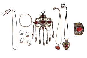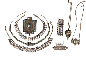 lot: old ethnologic jewelry, Turkmenistan/Afghanistan, 10 pieces, silver, 1 broad bangle width = 39.3 mm, inside c. 54.5 x 45.6 mm, 2 necklaces with pendant, 1 decorative pendant with 7 hanging boat shaped elements, height = 17.5 cm, 4 rings ring width c. 52, 57, and 58, 1 necklace and 1 bracelet, total c. 230 g