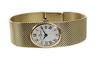 Damen-Armbanduhr, BAUME & MERCIER Geneve, Handaufzug, GG 750/000, sig. Baume & Mercier, röm. Ziffern, Schmuckkrone, Milanese-Band mit Klappschließe, B = 18,0 mm, L = ca. 17,0 cm, Uhr läuft, total ca. 48,3 g