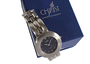 Damen-Armbanduhr, CHRIST, Quarz, blaues Ziffernblatt mit Strichindex, zent. Sek, D = 32,0 mm, Band zur Hälfte als Spange, Uhr läuft !