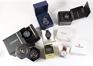 lot: 7 men's watches, 1 x DUGENA steel chrono, 1 x TRASER, 1 x CASIO Multi Lingual DATA BANK (is running), 1 x FESTINA, SPHIRE self-winding, 1 x CITIZEN ECO DRIVE TITANIUM (is running), 1 x PULSAR SOLAR, 1 x CASIO G-SHOCK (watch is running), all watches are unchecked !
