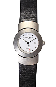 Damen-Armbanduhr, Porsche Design by IWC, Titan, 1993, Quarz, weißes Ziff.-Blatt, zent. Sek., Dat. auf 3 Uhr, Boden 4-fach verschr., D = 28,2 mm, N° 2538154, Lederband mit Original Dornschließe, Garantiekartearte, ungeprüft !
