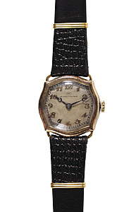 ladies watch, ART-DECO 1920/'30s, IWC Schaffhausen, yellow gold 585/000, signed IWC, mechanism signed IWC, Arabic numerals, blued hand, diameter = 21.0 mm, leather watchstrap with gold colored applications, pin buckle, watch is running!
