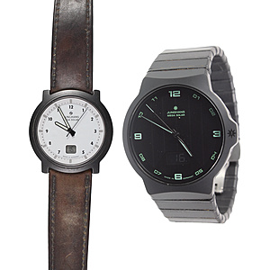 lot: 2 men's watches, JENSEN, steel (black anodized), quartz, dark grey clockface, dot index, snap off case back, case c. 27.1 x 30.5 mm, signed GEORG JENSEN DENMARK, THORUP & BONDERUP, original watch strap, length = c. 17.5 and 18.5 cm, unworn, watches are running!