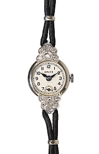 Damen-Armbanduhr, ART-DECO 1920/30er Jahre, WG 585/000, 56 Zolotniki (für den russischen Markt), Handaufzug, sig., ORLYS, kl. Sek. auf 6 Uhr, seitlicher Steinbesatz: 12 Diamanten/Brillanten ca. 0,36 ct w-si, D = 18,3 mm, Boden mit Scharnierbewegung, Stoffband mit Klappschließe (Band sollte erneuert werden), L = ca. 17,0 cm, Uhr läuft, Revision erst vor kurzem durchgeführt !