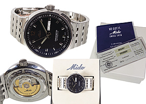 men's watch, MIDO Switzerland 2003, steel, self-winding, black clockface, central second, sapphire glass, diameter = 41.7 mm (without crown), different glass bottom, N° 8340 (10164014), steel strap with folding clasp, push piece at the side, watch is running, with original box and documents, very good condition!