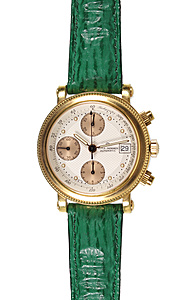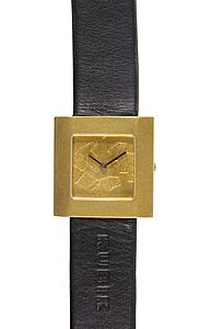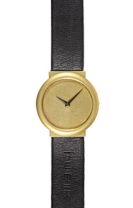 designer men's watch, yellow gold 750/000, heavy produced case, structured clockface, snap off case back, diameter = 34.2 mm, leather watchstrap with yellow gold 750/000 clasp, total with watchstrap 48.8 g, watch is running ! unworn, original price € 5800,-