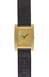 designer men's watch, yellow gold 750/000, heavy produced case, structured clockface, small brilliant c. 0.045 ct w-si, snap off case back, slightly bent case, c. 26.0 x 36.4 mm, leather watchstrap with yellow gold 750/000 clasp, total with watchstrap 50.4 g, watch is running ! unworn, original price € 7200,-