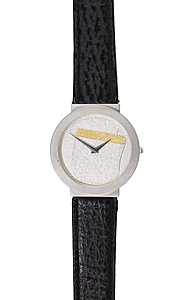 designer wristwatch, quartz, silver 925/000, circular case, clockface soldered with gold, snap off case back, diameter = 34,2, black leather watchstrap (shark) with silver clasp, watch is running ! unworn !