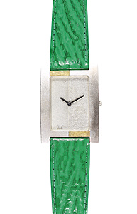 designer wristwatch, quartz, silver 925/000, rectangular case with asymmetric gold soldered, structured clockface half devided, snap off case back, c. 30.0 x 40.0 mm, green leather watchstrap (shark) with silver clasp, watch is running! unwor!