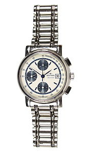 men's watch, JEAN PAUL, chronograph, steel, self-winding, white clockface, line index, day/date on 3 o'clock, indication of the second, minute and hours, tachymeter scale, diameter = 37.5 mm (without crown), leather watchstrap with pin buckle, unworn, watch is running !