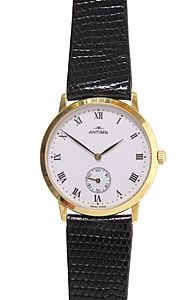 Herren-Armbanduhr, ANTIMA, GG 750/000, Handaufzug, weißes Ziffernblatt, röm. u. Punkt Index, kl. Sek. auf 6 Uhr, gedr. Boden, D = ca. 32,5 mm (ohne Krone), Kal. ETA Peseux 7001, Original-Lederarmband mit Dornschließe. ungetragen, Uhr läuft !