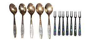 Lot: 5 Russische Kaffeelöffel, Silber 875/000 verg., Nielloeinlage, L = 13,8 cm; 6 kl. Gabeln, Silber 875/000, farbig emailliert, L = 93,3 mm, beide angelaufen, total 164,6 g