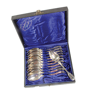 12 Stck. Kaffeelöffel (SPATEN) von CHRISTOFLE, Monogrammiert: H.T., L = 13,7 cm, Originalschatulle, schöner Zustand !