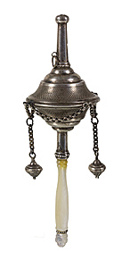 rattle with integrated pipe, first half of the 19th century, silver with nacre handle, two at little bells hanging on a chains, fine ornamented surface, diameter = 49.5 mm, length = 16.0 cm