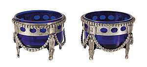 2 Salieren im Louis Seize Stil, Empire um 1830/50, Silber (12 Lot), sig., AH o, AR ? (nicht genau zu Lesen), umlaufende Girlande, Band mit ovalen Durchbrüchen, cobaltblauer runder Glaseinsatz, D = ca. 70,0 mm, H = 50,5 mm, total 278,0 g