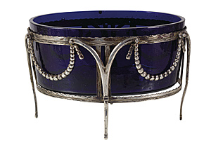 Jardinaire in Louis Seize style, Empire around 1800, silver, all round garland, cobalt blue oval glass insert, c. 15.0 x 9.5 x 10.5 cm, total 445.0 g