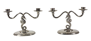 a pair of double arm candelabrums, seehorses, silver 835/000, signed: heraldic shield (symbol) JF, plastic formed seehorses on an oval base, base plate made of alpacca, height = c. 13.5 cm total 563 g, unusual!