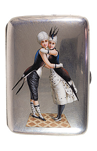 cigarette case art nouveau, erotic dance scene, Austria around 1900/10 (Vienna?), silver, colored enameled frivolous scene of a couple in love, spring-cover, soft rounded rectangular shaped, c. 68.3 x 97.3 x 18.0 mm (back with small tender spot), similar cases by G.A.Scheid (Vienna), total 129.8 g