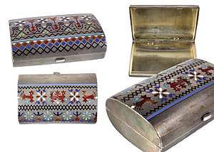 well-designed cigarette case, Russia around 1890/1900, silver 88* zolotniki, signed AL (AC ?), bulbous curvedon both sides and colorful enameled (subdued patches with flaws !), graphic ornaments across cover and bottom, c. 81.7 x 54.0 mm, height = 32.2 mm, total 129.5 g, unusual!