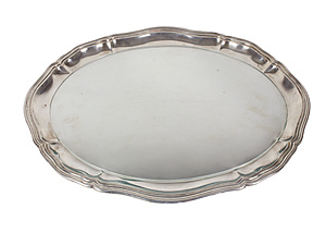 Tablett, Silber 800/000, sig. Pferd nach links im Oval (Gebr. Kühn Silberwarenfabrik Schwäb. Gmünd), reliefierter, gewellter Rand, ca. 43,0 x 33,0 cm, total 1124 g, ovale Glasplatte als Bodenschutz !