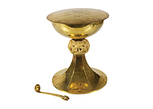 Messkelch und Kelchlöffel aus den 1920/30er Jahren, Silber 900/000 feuervergoldet, Zwischen Kelch unf Fuß eine geschnitzte Dornenkrone aus Bein, gravierte Patene mit Christlichen Symbolen, Kelch mit feiner Hammerschlagstrucktur, D = 14,5 cm, H = 17,0 cm (leichte Flecken), total 938 g. Mit Originalschatulle zum Aufbewahren !