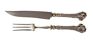 Tranchierbesteck um 1900, Silber 800/000, sig. Koch & Bergfeld, verg. Stahlansätze (berieben), Griffe als Greiffuß gearbeitet, eine Kugel haltend, fein reliefierte Oberfläche, L = 29,0 u. 32,5 cm, total 304 g