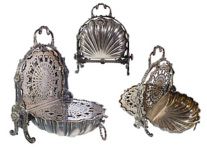 Viktorianische Biskuit/Keksdose, England 19.Jhd., versilbert (ENP Plated), Dose in Muschelform ausdruckstark ausgearbeitet, beidseitig von der Mitte zu zwei Fächer zu öffnen, die Fächer sind jeweils mit einem durchbrochenen Deckel verschlossen, ca. 24,0 x 27,0 cm, tief ca. 12,0 cm, total 1,75 kg