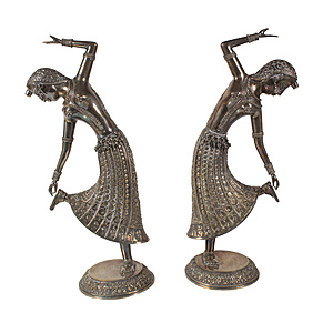 a pair of Indian temple dancers, silver 925/000, floral textured surface, height = c. 33.5 cm, (1 ear pendant is missing), total 1148 g