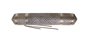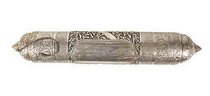 JUDAICA Mezuzah scrolls case around 1900, for a Torah scroll, silver (tested), fine textured surface with delicate breakthroughs, diameter = 5.1 cm, length = 29.0 cm, total 280 g