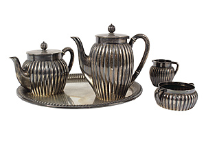 5-part service, ART-DECO 1920s, silver 800/000, signed KOCH &BERGFELD (Bremen) for HESSENBERG, ribbed sides, cans with hinged cover, 1 small mocha pot height = 15.0 cm, 1 teapot height = 11.3 cm, 1 milk can height = 6.0 cm, 1 sugar vessel diameter = 8.2 cm and a suitable tray, diameter = 28.0 cm (all items with model numbers) total 1.286 kg