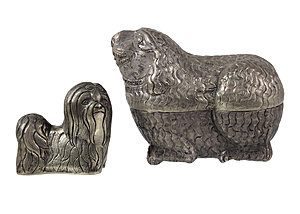 Lot: 2 Chinesische Hunde, größere als Dose gearbeitet, Silber (geprüft), reliefierte u. strukturierte Oberfläche; gr. Hund H = 8,0 cm, kl. Hund H = 5,3 cm, total 144 gr