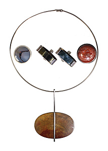 lot VINTAGE: silver 925/000, partially signed: among others 2 x A.La DENMARK, 1 x G.R., 1 x W.WL, four very expressive designer rings with quartz variations and 1 hawk's eye, pendant with big jasper disk height = 82.5 mm, with 1 silver necklace