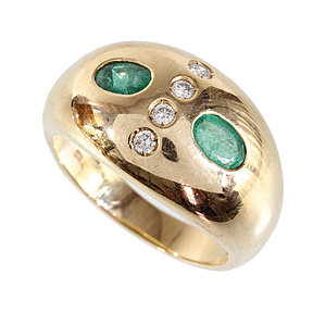 ring, yellow gold 585/000, 2 emeralds (faceted) c. 0.8 ct, 4 brilliants c. 0.16 ct w-si, ring width c. 61, total 10.0 g