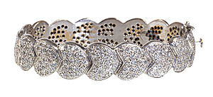 bangle heart, white gold 585/000 (tested), bangle consist is made of 14 paved hearts, 340 brilliants c. 3.5 ct w-si, in an additionally heart is an integrated box clasp with safety catch, width = c. 12.6 mm, inside c. 55.0 x 45.0 mm, total 45.5 g