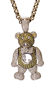 pendant, teddy bear, white gold 750/000, surface paved with 233 brilliants c. 1.5 ct tw-vsi, in the face and body yellow faceted stones, in stomach 3 floating brilliants, limbs are slightly moveable, loop can be open, height = 61.1 mm, total 35.7 g, with a pea chain, white gold 750/000, length = 50.0 cm, all total 50.0 g