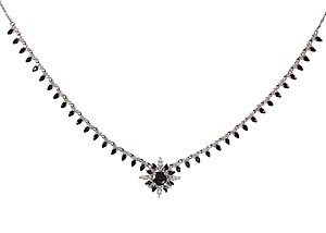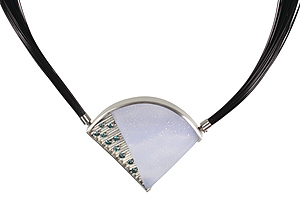 DESIGNER COLLIER, PLATIN, sig. K.RU, Mittelteil als Brosche gearbeitet, 10 blaue Brillanten ca. 0,9 ct auf gewellter Oberfläche, fein kristalliner Calcedon, Brosche: ca. 56,0 x 47,0 mm. Kunststoffschnur ca. 86-fach mit Patentschließe (Heinz Schließe), Gesamt L = 48,0 cm
