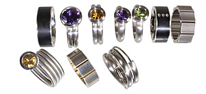 Lot Stahlschmuck: 10 Ringe, Stahl/Stahl-Gold, verschiedene Edelsteine, Amethyst, Citrin, Peridot u. Brillanten, 2 Ringe mit schwarzer Einlage, RW ca. 52-60