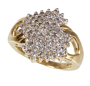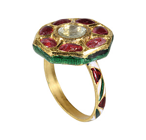 heavy worked VINTAGE-ring from the 1960s, yellow gold 585/000 (tested), hallmarks aren't interpretable, in the radially wreath always 2 brilliants, rubies, sapphires and emeralds, ring width c. 53, total 13.4 g