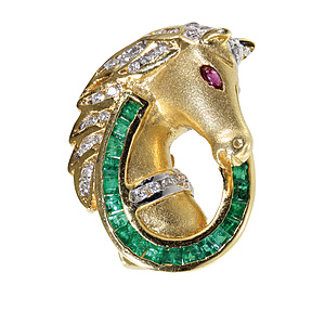 dress clip/brooch Tutti Frutti, CARTIER Paris 1960s, yellow gold 750/000, signed Cartier Paris N° 736, colorful flower bouquet in a basket, 8 brilliants c. 0.25 ct, always a ruby, sapphire and emerald (engraved leaves), 1 intensive colored ruby c. 0.50 ct, c. 25.0 x 32.0 mm, total 11.1 g