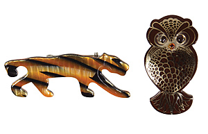 lot: 2 brooches, signed LEA STEIN PARIS, 1 owl with applied eyes, c. 27.0 x 50.7 mm, 1 panther/tiger ?, c. 62.7 x 23.5 mm, laminated cellulose acetate, metal brooch element
