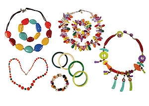 multicolored lot, plastic/glass, 4 bangles, 1 bracelet and 1 chain fruits, 1 bracelet and 1 chain, garish drops, 1 more bracelet and 2 chains