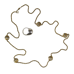 lot: 1 necklace (worn), Fa. GROSSE, signed GROSSE 1973 GERMANY, length = c. 80.0 cm, 1 ring, silver 925/000, signed GROSSE 1971 GERMANY, ring width c. 54 (modifiable size!)