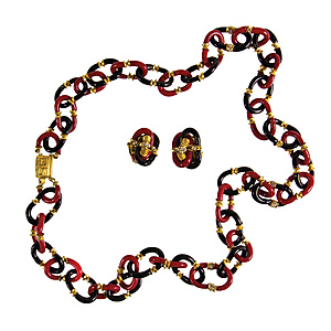 Lot: Armband und Collier, Metall goldfarben, 2 PANTHER, sig. P & P, schwarzer Lack, farbloser Strass, rote Steinaugen (fac.), 1 Armband, L = ca. 19,0 cm; Collier, L = ca. 44,5 cm, beide mit Klappschließe